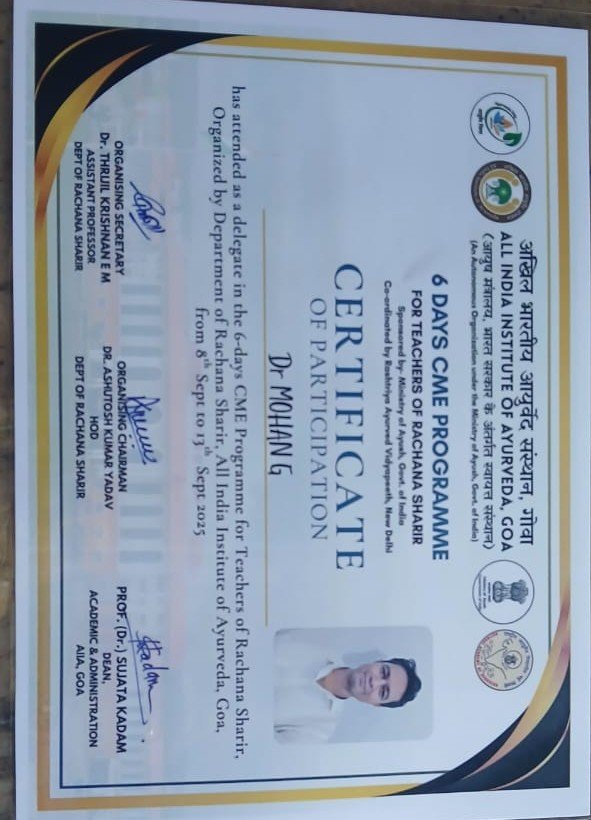 | NCISM MANDATES | Participation Certificate | Dr Mohan G, Professor & HOD Dept of Rachana Shareera | View |